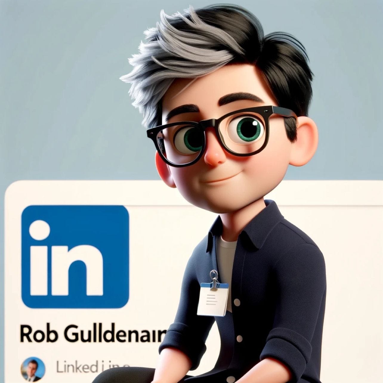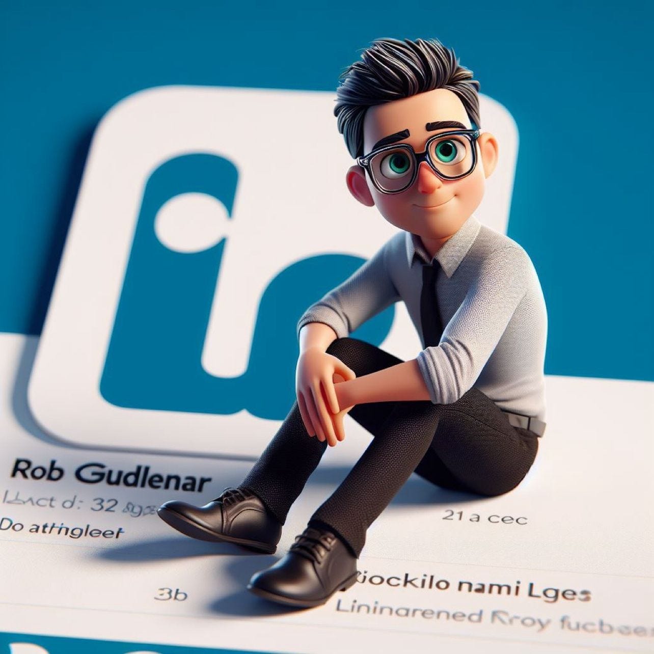PROMPT para avatar animado - Create a 3D illustration of an animated character sitting casually on top of a social media logo "LinkedIn". The character is a <pettite man, 32 age, black pants, short hair, trimmed on edges, half dark grey and half black hair, green eyes with transparent frame glasses, blue navy white collar dress>. The background of the image is a social media profile page with a user name "Rob Guldenaar" and a profile picture that matches the animated character